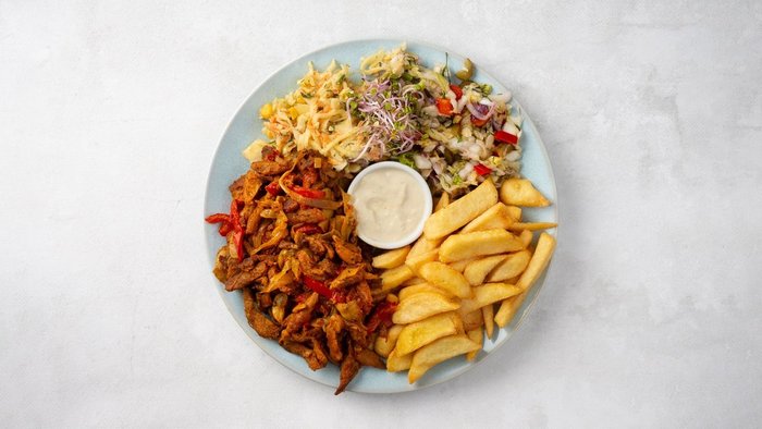 Danie inspirowane kuchnią Bliskiego Wschodu. Krajanka sojowa w aromatycznych przyprawach z pieczarkami, papryką i cebulką. Serwowane z ryżem, surówkami i sosem